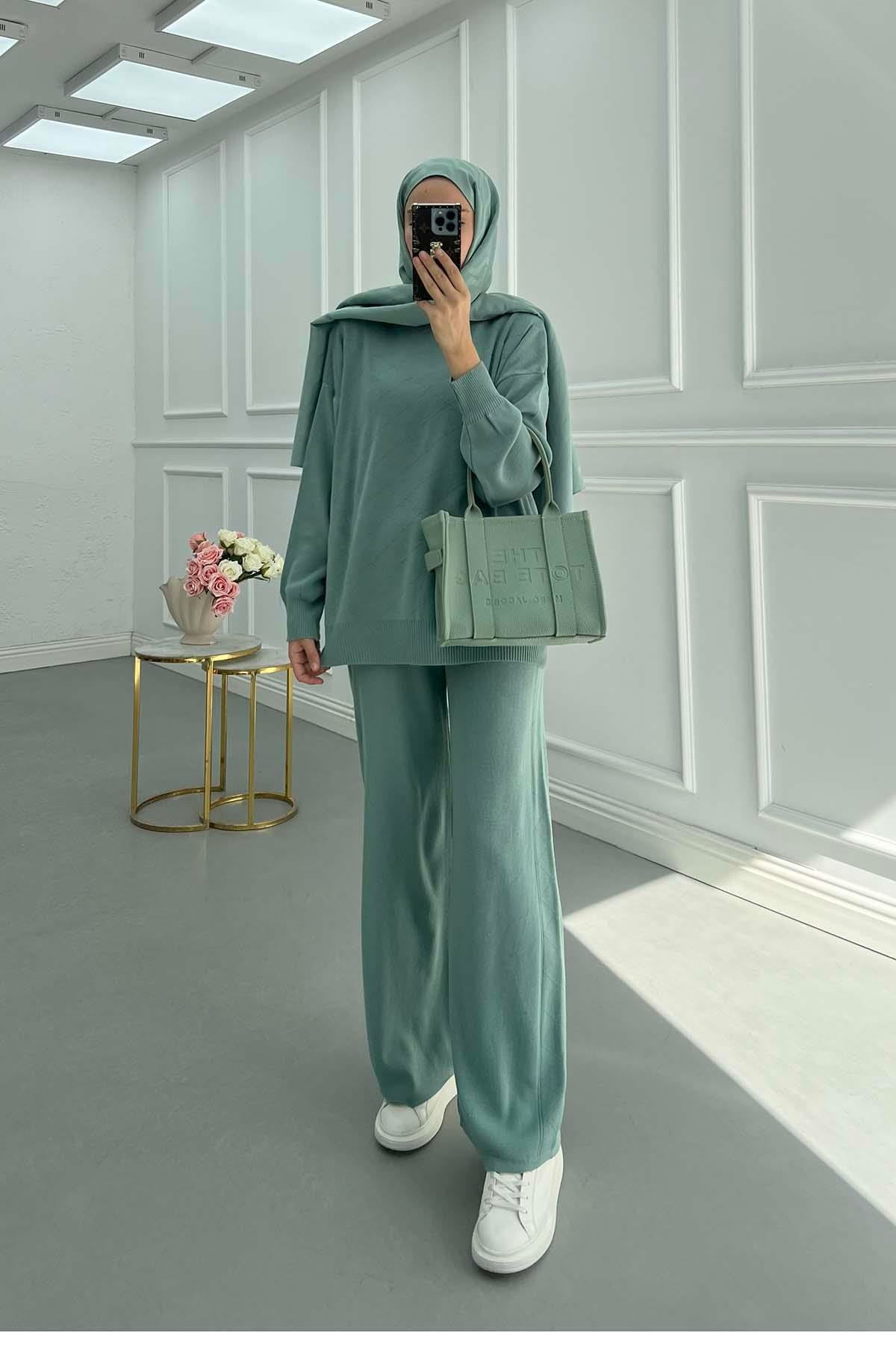 Arkası Uzun Desenli Triko Takım Su Yeşili