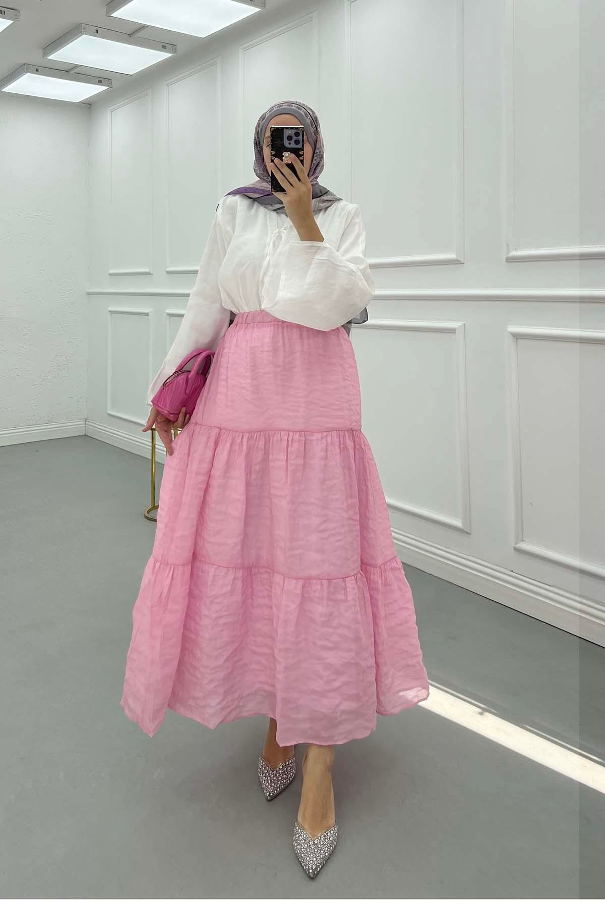 Astarlı Beli Lastikli Tül Etek Pembe (PDHTA5213)