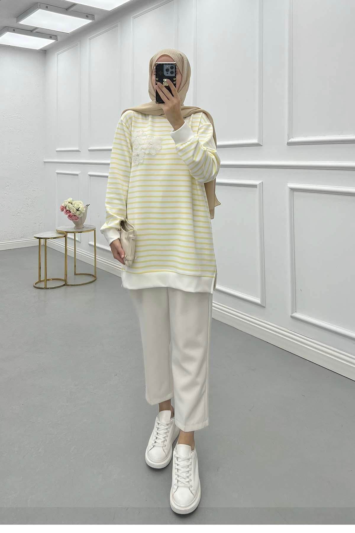 Çiçek Detaylı Çizgili Tunik Sarı (PDDN26156)