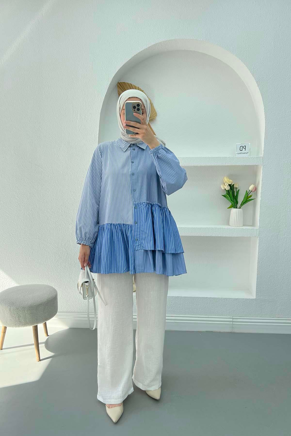 Çizgili Fırfırlı Tunik Mavi (PDKTC8076)