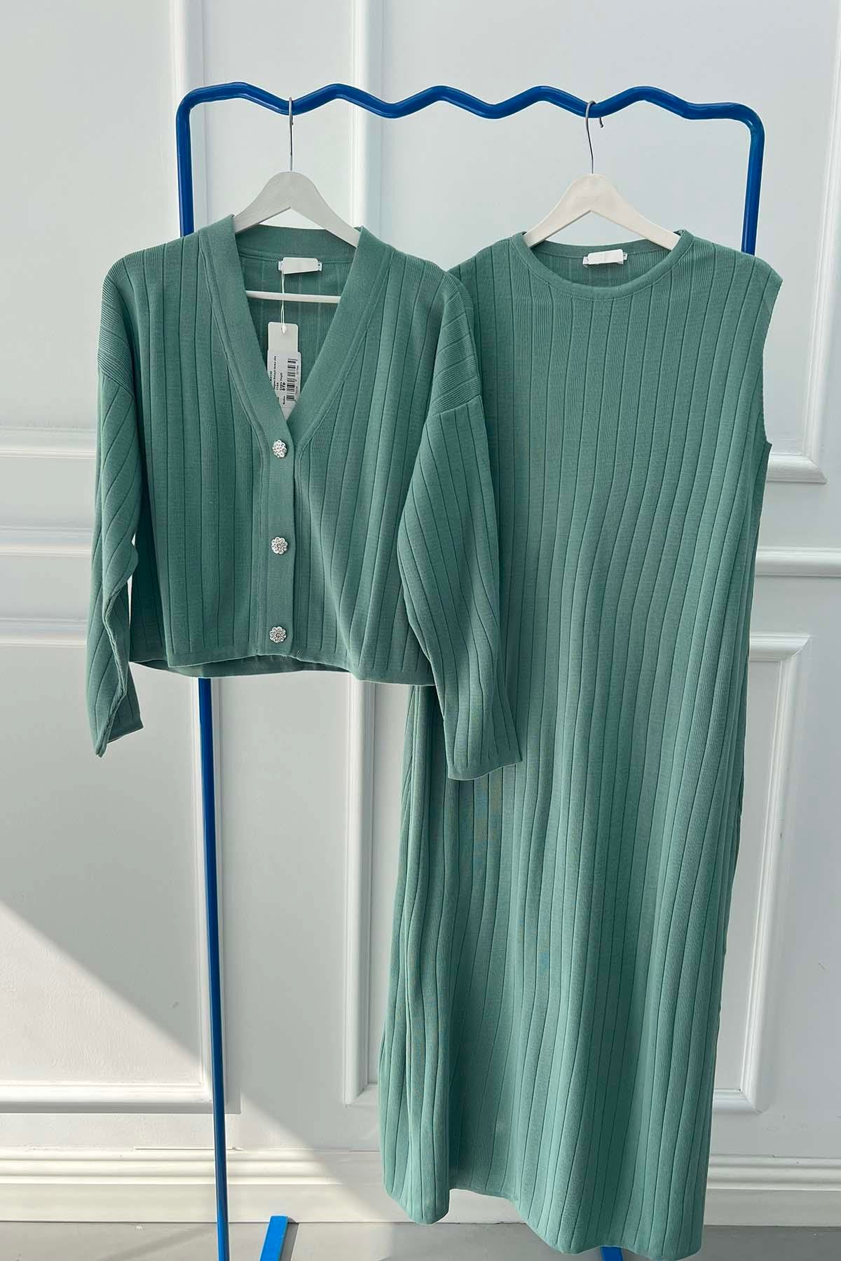 Düğme Detaylı Hırka Jile Triko Takım Çağla Yeşili