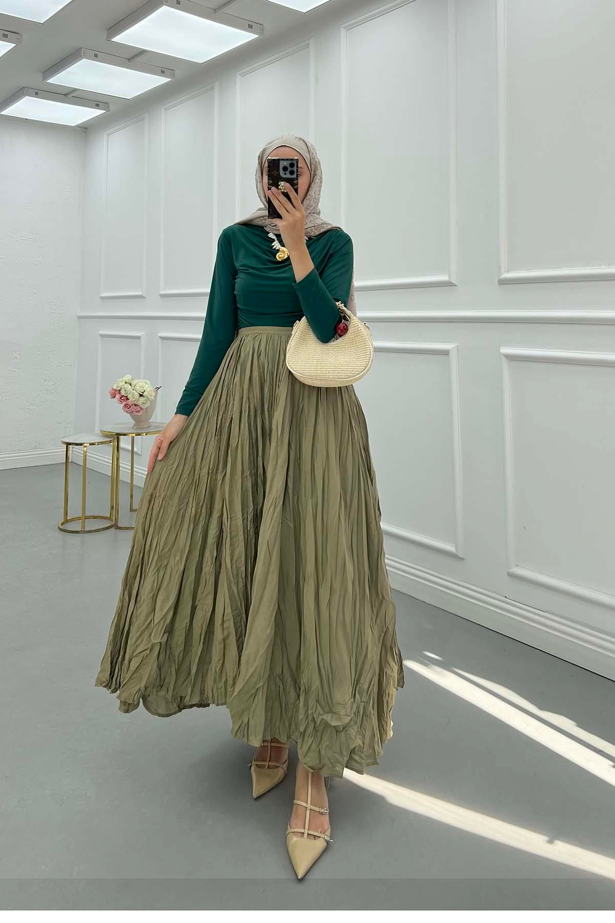 Fermuarlı Astarlı Kırışık Etek Yağ Yeşili