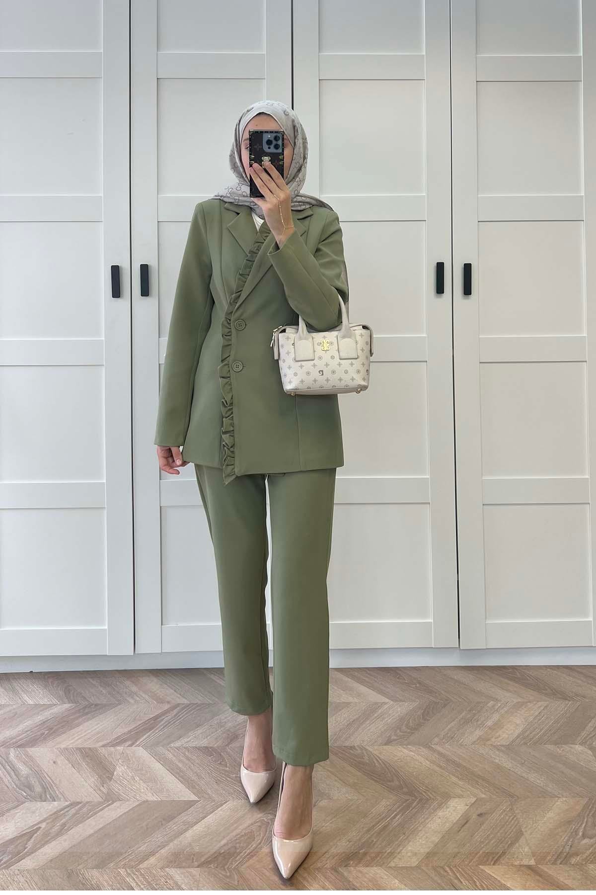 Fırfır Detaylı Astarlı Ceket Takım Haki