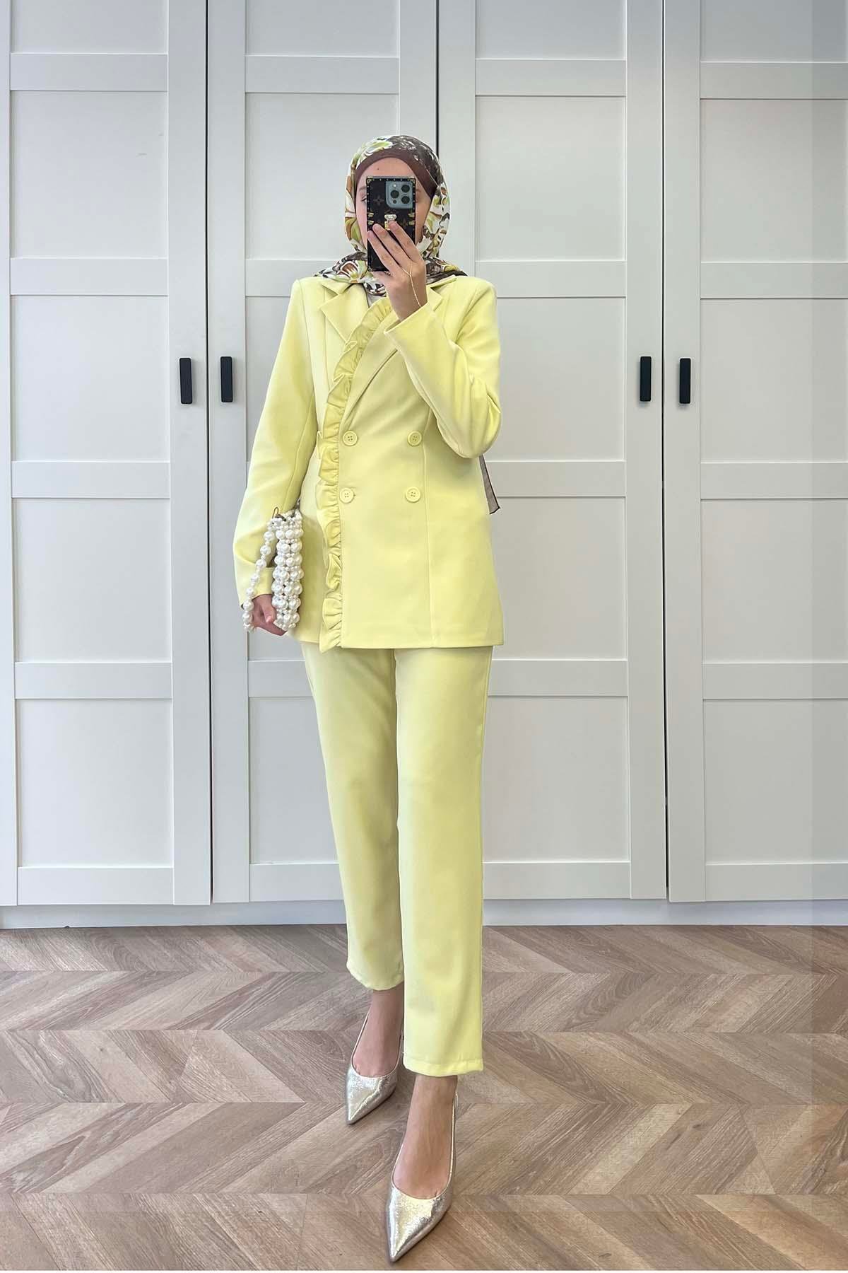 Fırfır Detaylı Astarlı Ceket Takım Yağ Sarısı (PDLN3107)