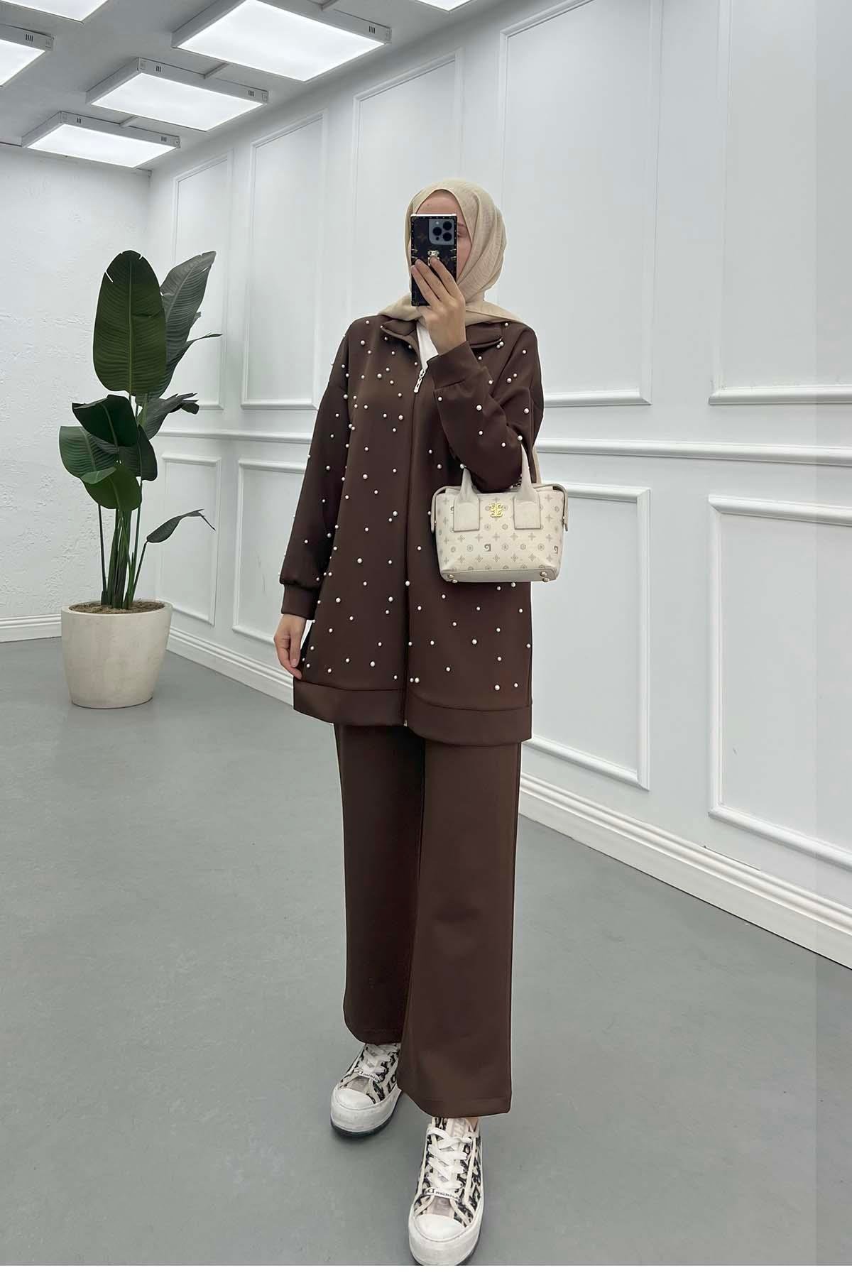İncili Fermuarlı Scuba Takım Kahve (PD3281)