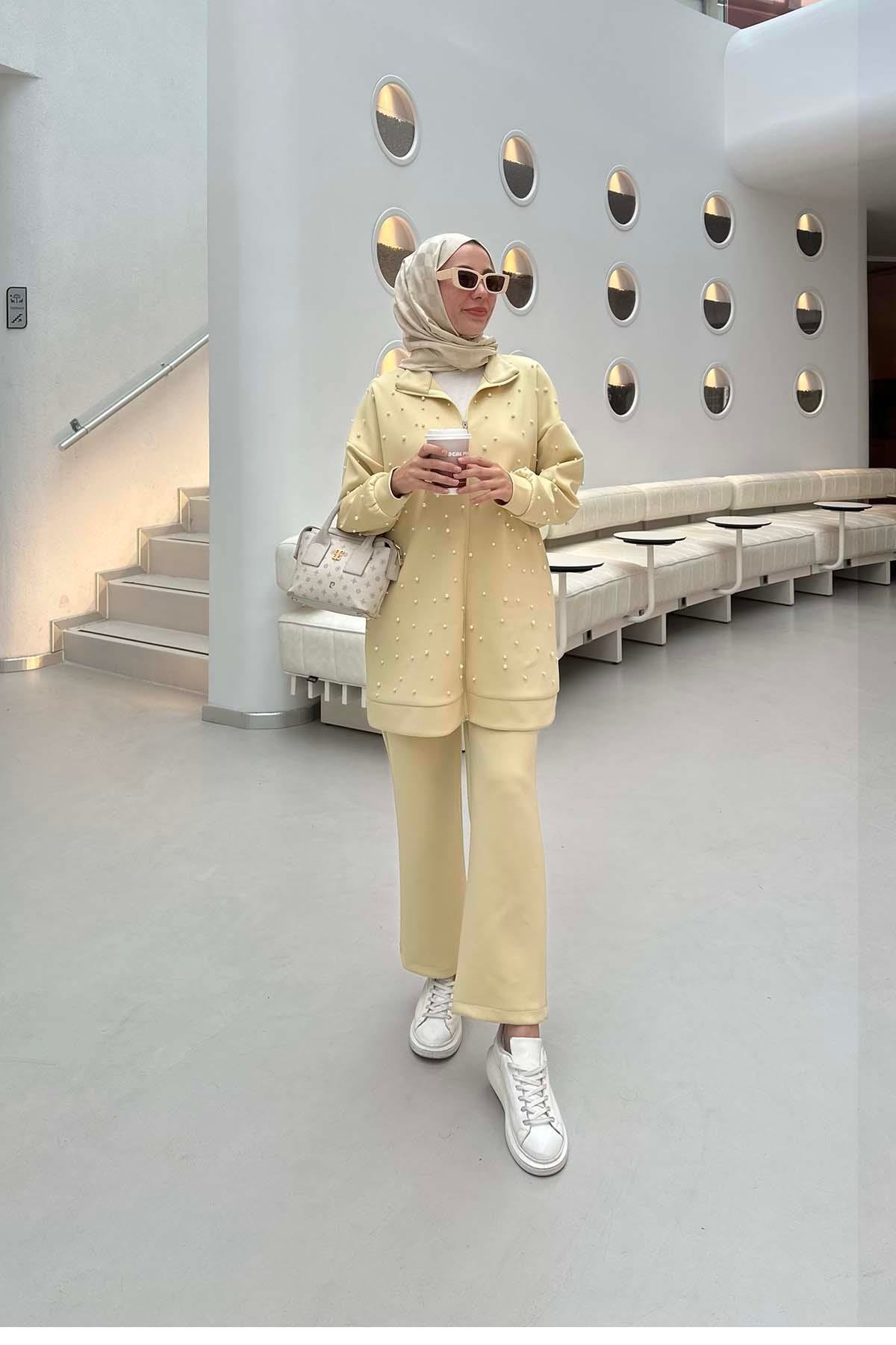 İncili Fermuarlı Scuba Takım Yağ Sarısı (PD3281)