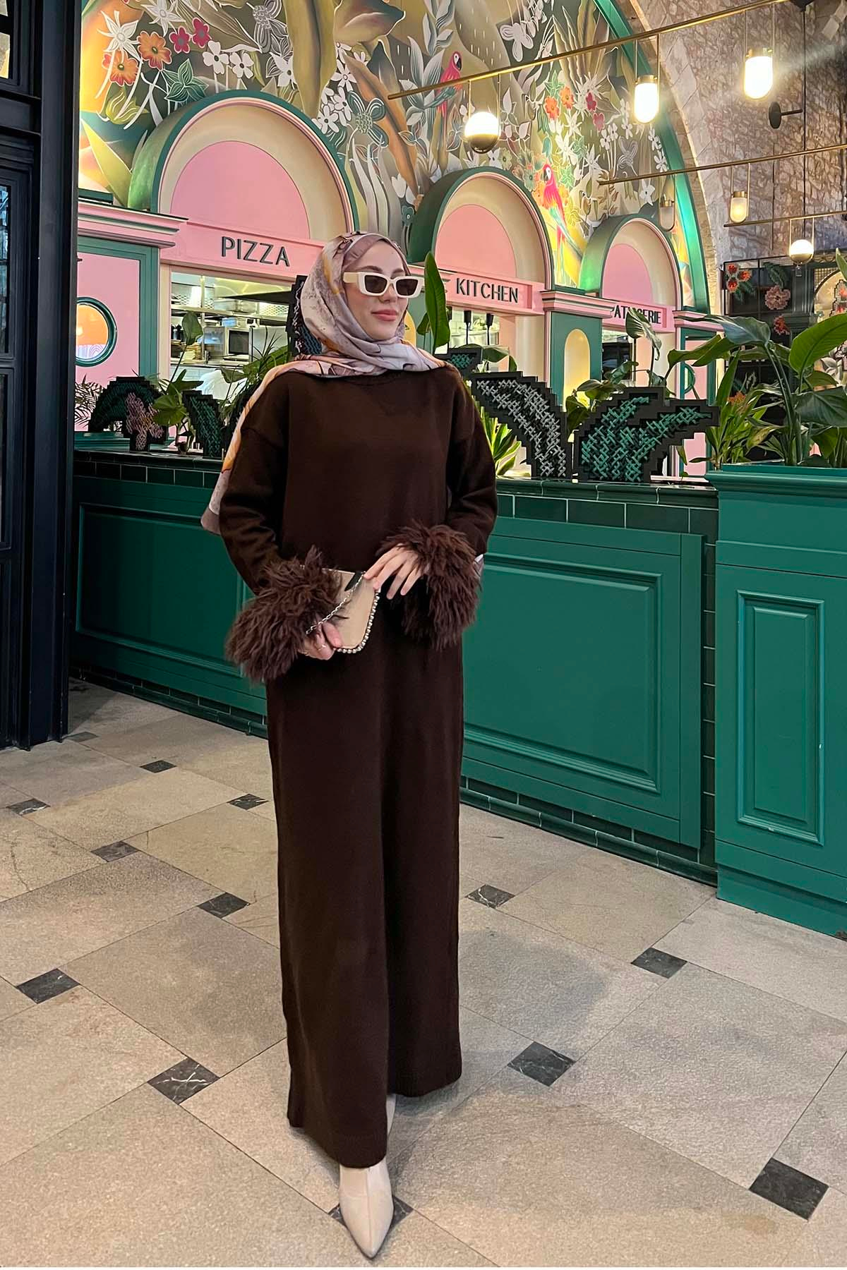 Kollar Püsküllü Triko Elbise Kahve (PDSG7409)