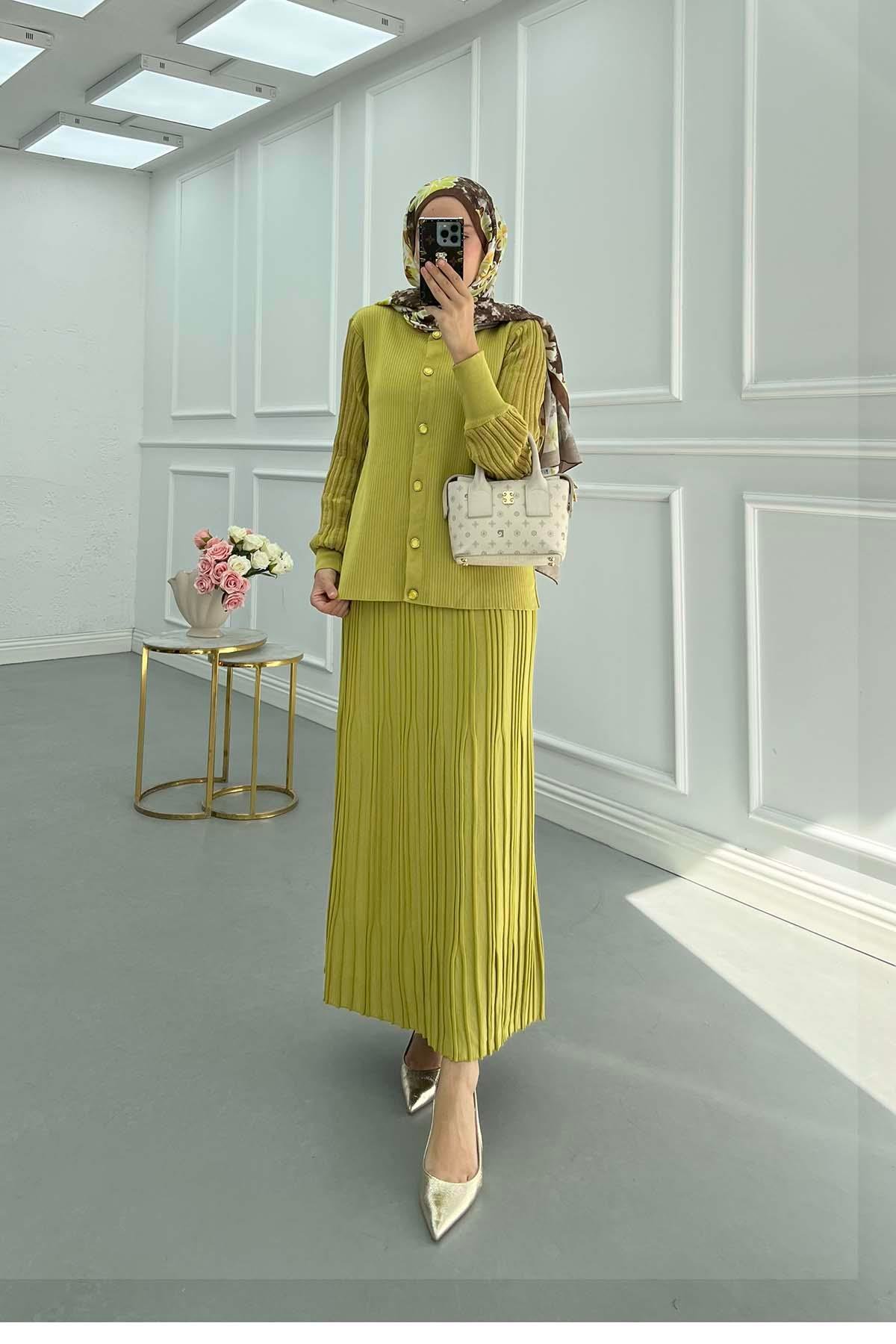Kolları Simli Etekli Triko Takım Yağ Yeşili (PDGX14045)