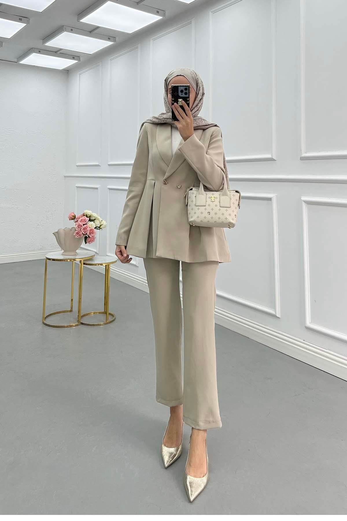 Pens Detaylı Double Krep Ceket Takım Bej (PDNU2987)