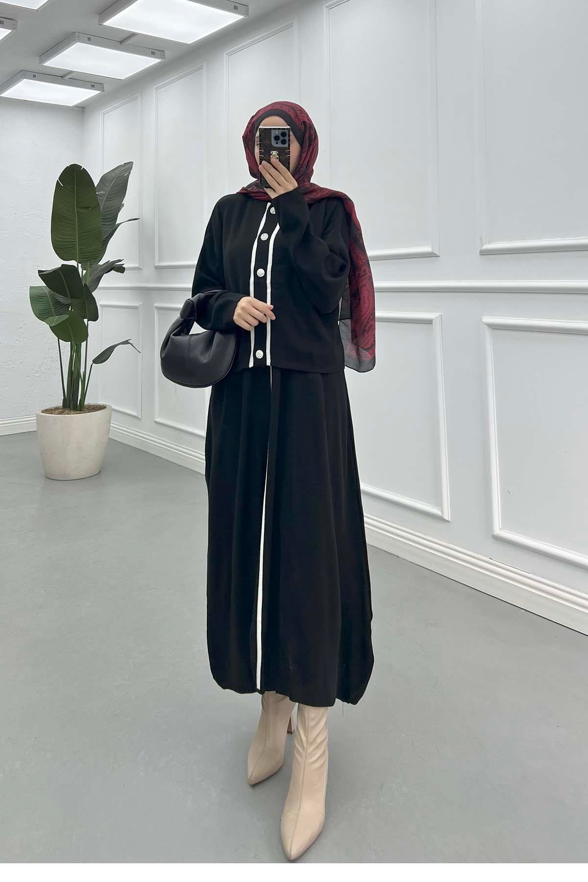 Şerit ve Düme Detaylı Hırka Jile Takım Siyah (PDYLW4127)