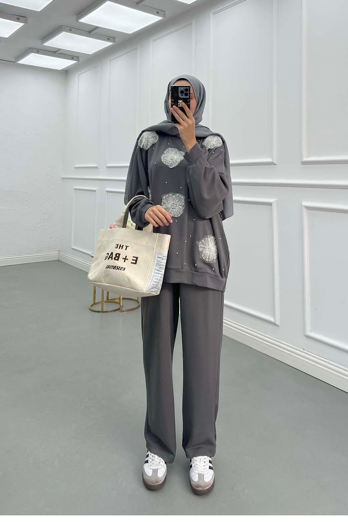 Tül Çiçek ve Taş İşlemeli Sweat Takım Gri (PDHTA7914)