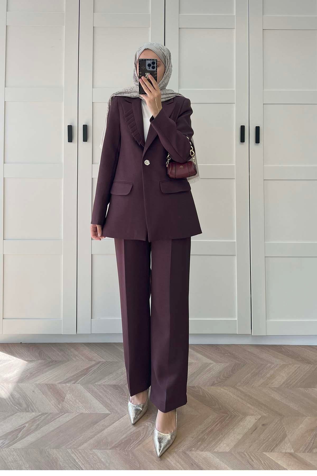 Yaka Detaylı Astarlı Ceket Takım Mürdüm